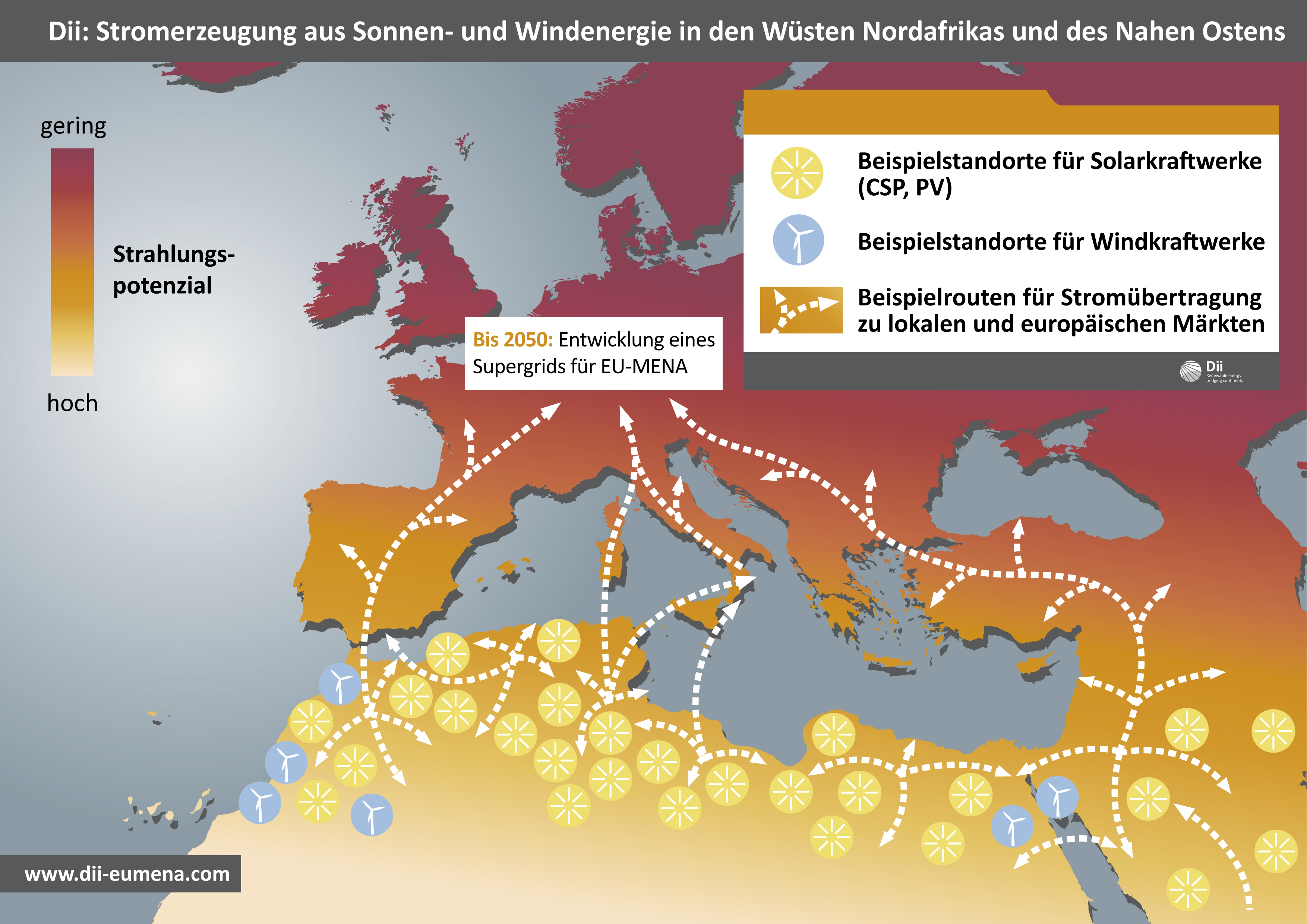 Auch das Wüstenstromprojekt DESERTEC von der Trans-Mediterranean Renewable Energy Cooperation (TREC) erstellt, bietet Antworten darauf wie, selbst bei Engpässen, genügend Strom aus regenerativen Energien zur Verfügung gestellt werden kann. Ausgehend von der Tatsache, dass in Wüstengebieten in 6 Stunden mehr Energie empfangen wird als die Menschheit in einem Jahr verbraucht, wurde in Studien des DLR berechnet, dass in 40 Jahren mit Hilfe von solarthermischen Kraftwerken mehr als 50% in der sog. EUMENA (Europe, Middle East, North Africa) Region Strom ökonomisch erzeugt werden kann. Laut DESERTEC ist es möglich, die erzeugte Energie aus diesen Anlagen, mit Verlusten von weniger als 3% pro 1000 km, über Hochspannungs-Gleichstrom-Übertragungsleitungen (HGÜ) zu transportieren. Da mehr als 90% der Weltbevölkerung in einer Entfernung von weniger als 3000 km von Wüstengebieten leben, bietet die HGÜ-Technik große Potentiale für die Stromversorgung aus regenerativen Energien. Der Vorteil der Solarthermie gegenüber der Photovoltaik liegt in dem Verfahren der Stromgewinnung. Die aufgefangene Sonnenstrahlung wird in Wärme umgewandelt. Diese treibt Turbinen zur Stromerzeugung an. Da sich Wärme leicht speichern lässt, können solarthermische Anlagen auch bei Bewölkung oder Nachts, Strom liefern. Hierfür benötigt man neben den HGÜ ein grünes Stromnetz, das die verschiedenen Energieformen über effiziente Schaltstellen und den Einsatz von Fernleitungen mittlerer Kapazität bündelt. Die Umsetzung ermöglicht die Sicherstelung des Grundbedarfs. Der Spitzenbedarf kann über die. o.g. Stromspeicheranlagen vor Ort gesichert weden.